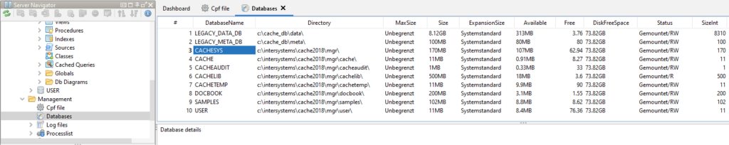 The Database viewer provide information about the databases on the selected Caché or IRIS Server. In InterSystems IRIS\Caché, any code runs in a namespace, which is a logical entity. A namespace provides access to data and to code, which is stored (typically) in multiple databases. A database is a file — an IRIS.DAT (or CACHE.DAT) file.