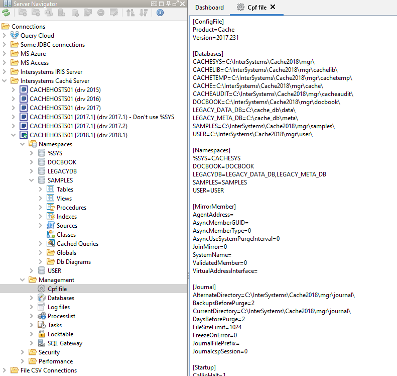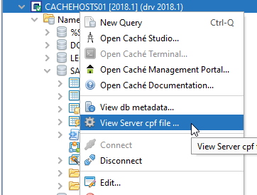 SQL Data Lens shows the active cache.cpf (or iris) file via tools menu for the selected Server.